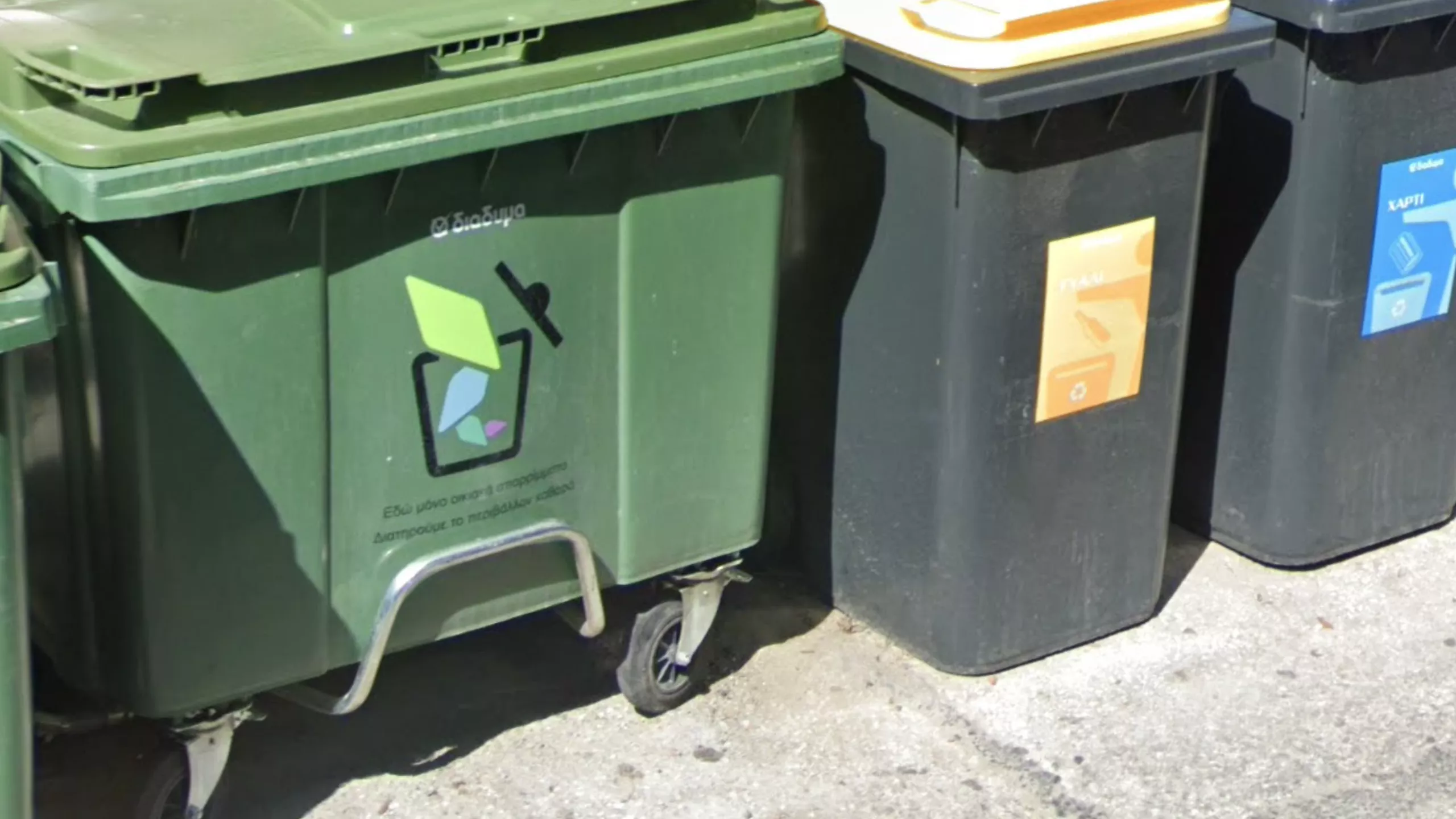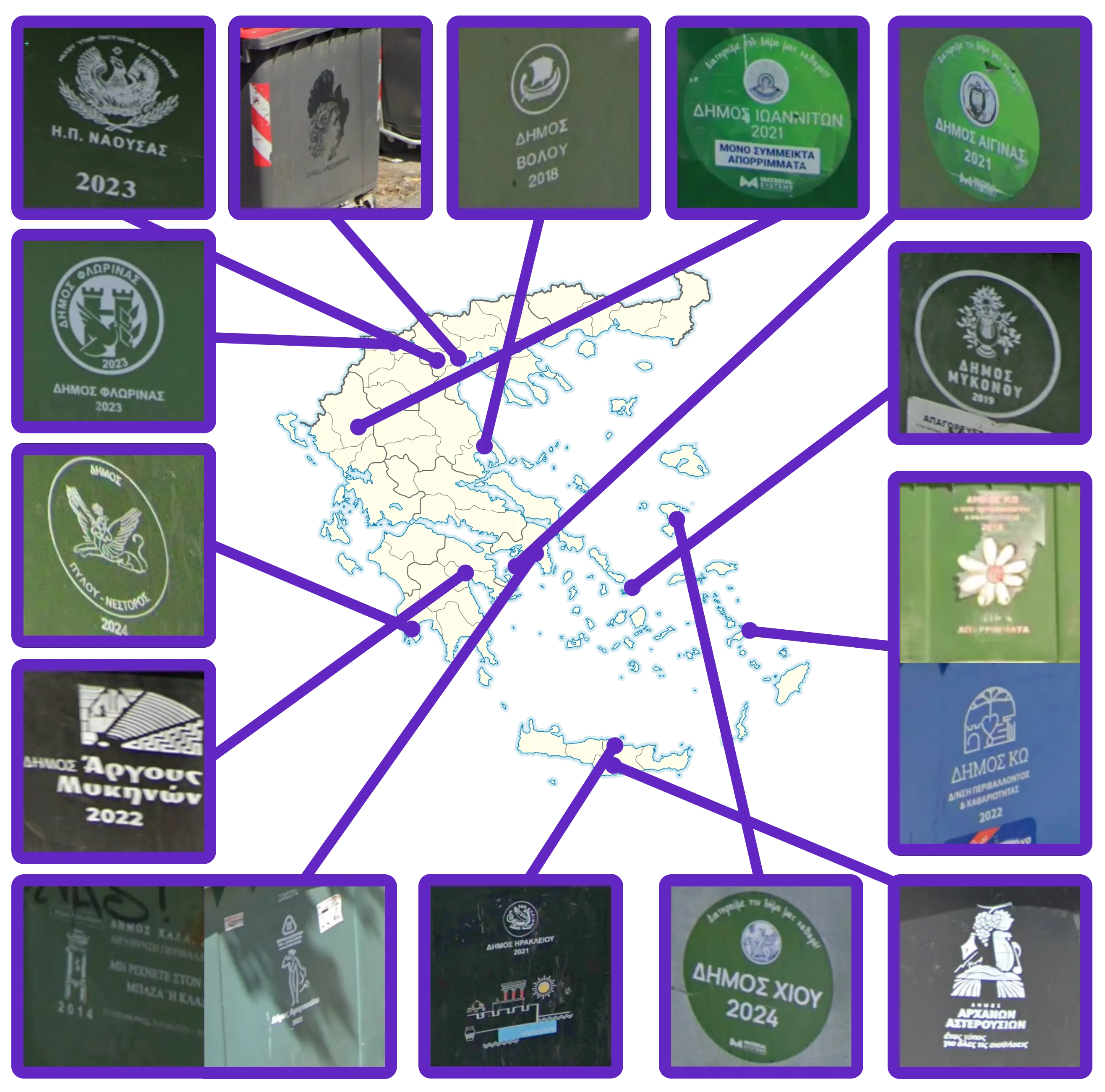 The most important word to recognise is ΔΗΜΟΣ (‘dimos’) meaning ‘municipality’ - the most important organisational unit. Municipality names can reliably be found on green bins (sometimes other bins) which should be a go-to place to look for in any urban or peri-urban rounds. Municipality names can more rarely be found on town entry signs, street signs and bus stops.