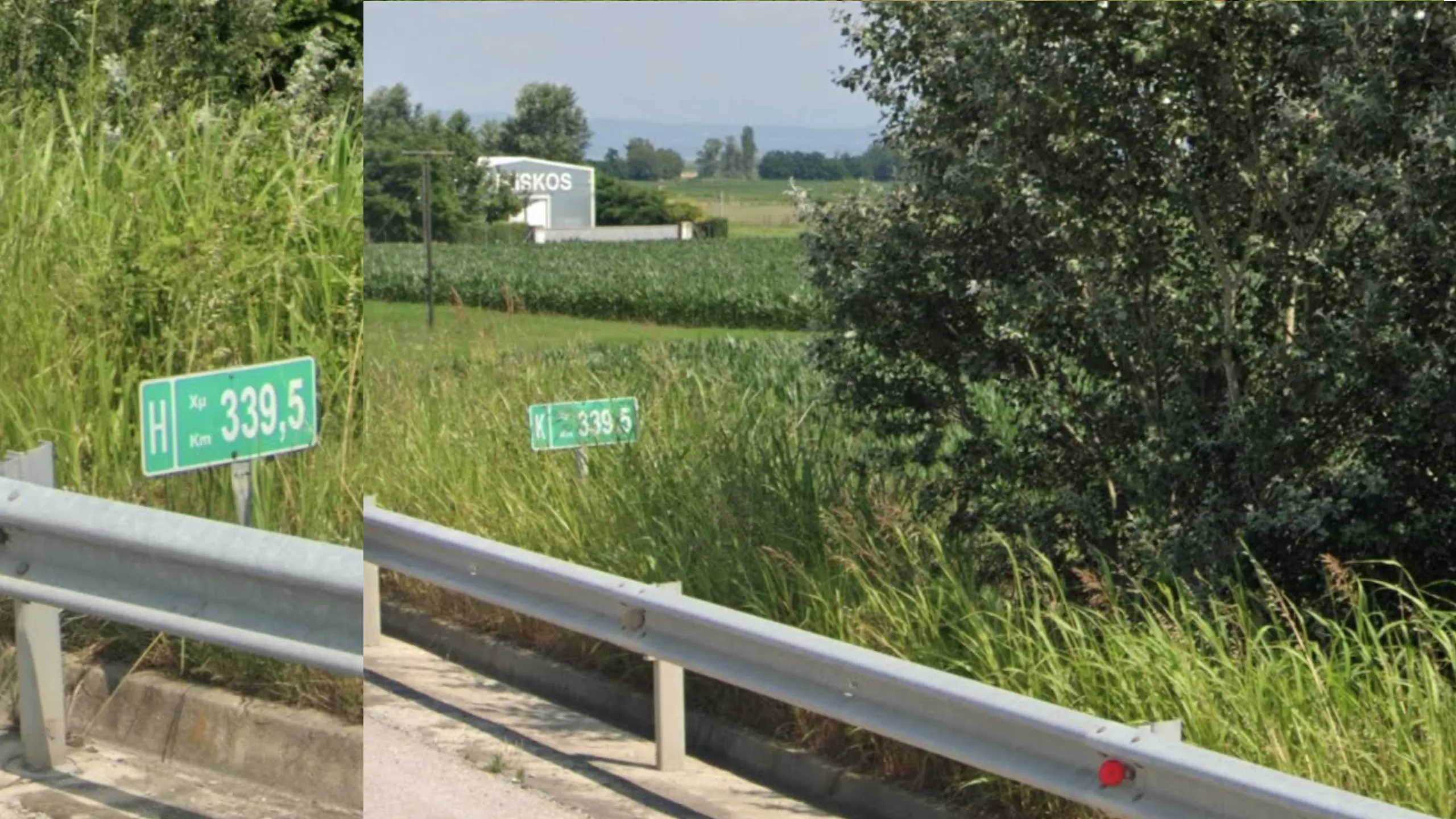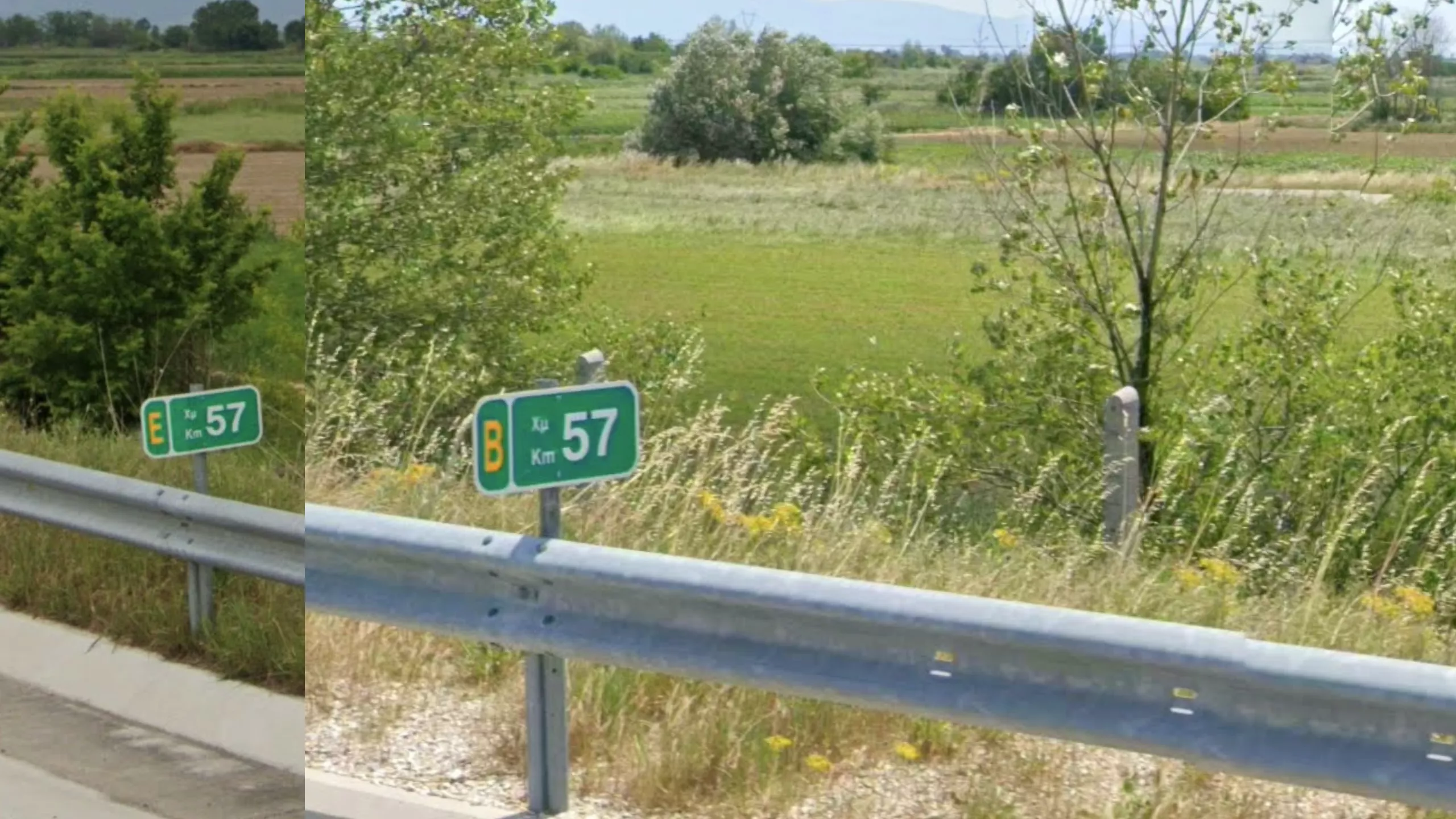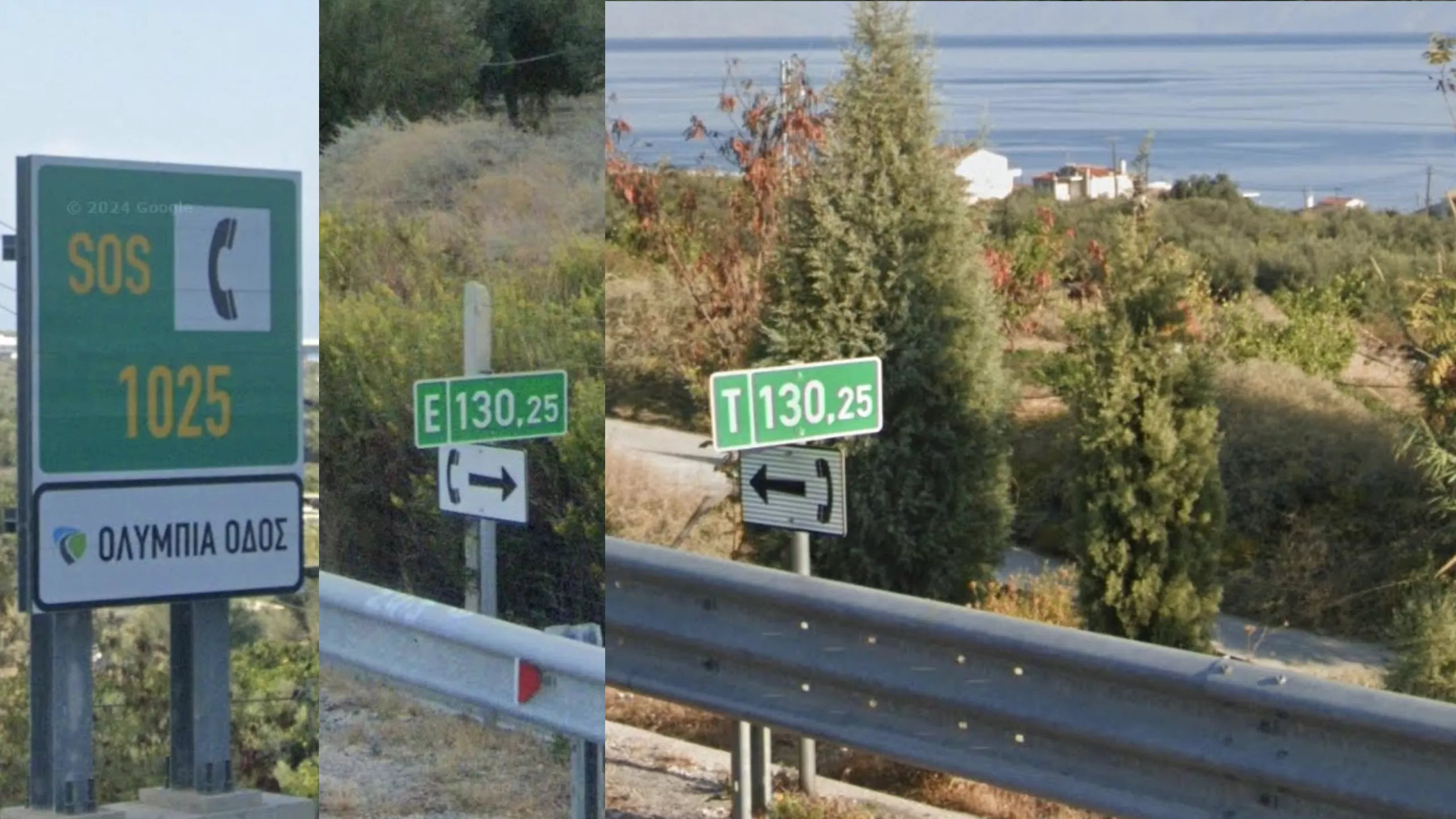 Some highways in Greece have unique and helpful kilometer signs that can help regionguessing. On most highways you will find green km signs every 500m that indicate the distance from the start point on the right side, and the first letter of the name of the town at the end of the highway on the left side. Note that the number from the start point is the same on both sides of the highway, whereas the letter is dependent on your driving direction. Also note that if you are in a moving game, these signs are symmetrical so you can always find the km sign for the other direction in the opposite lane.
