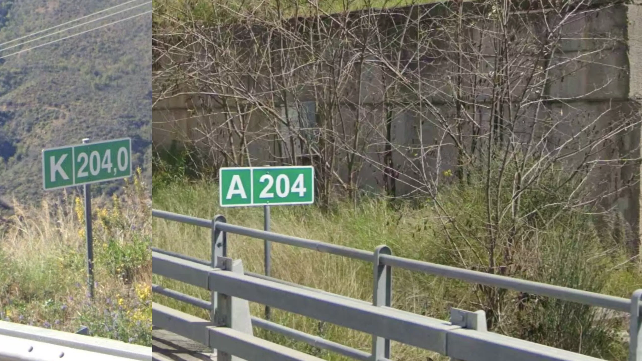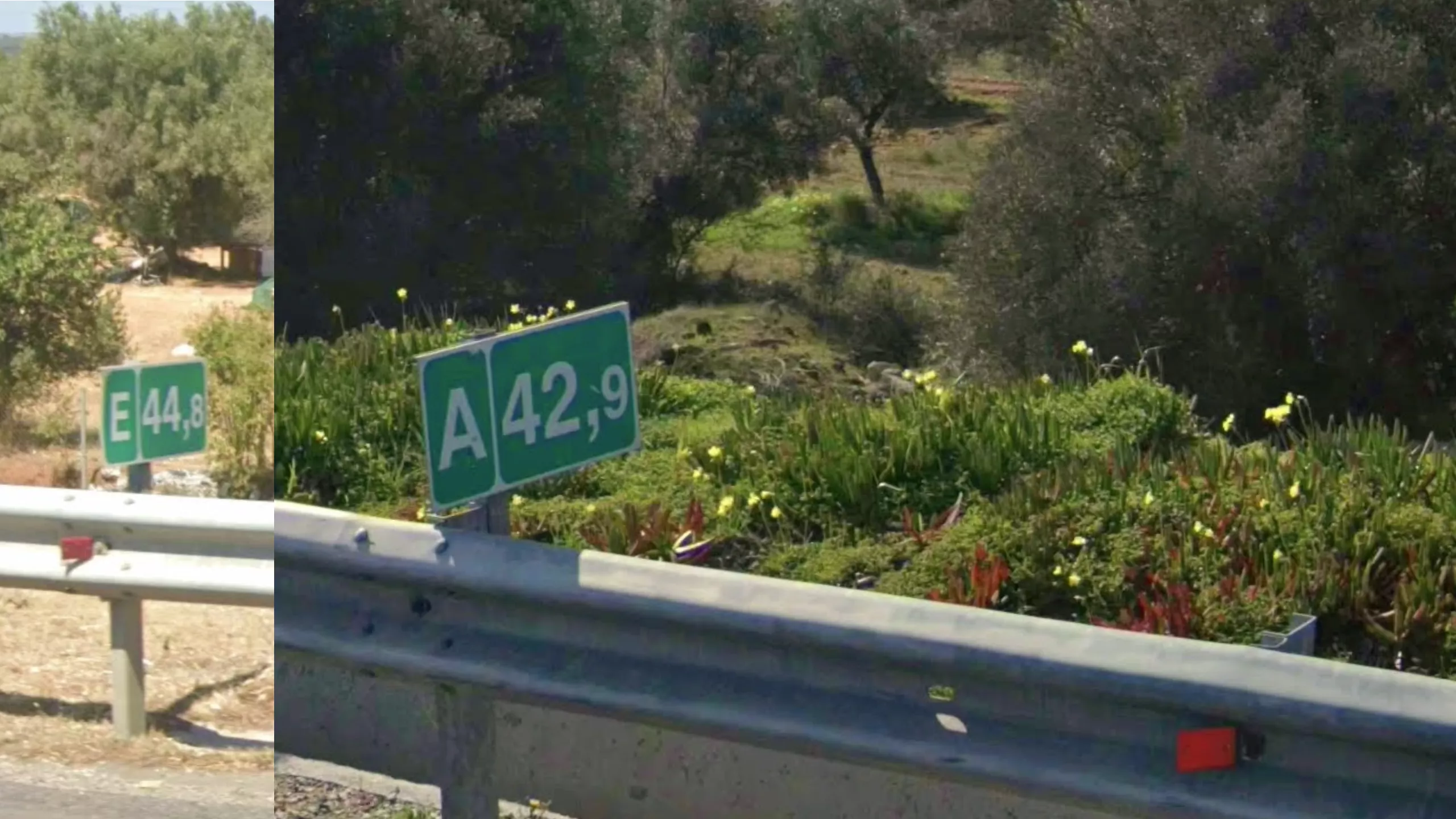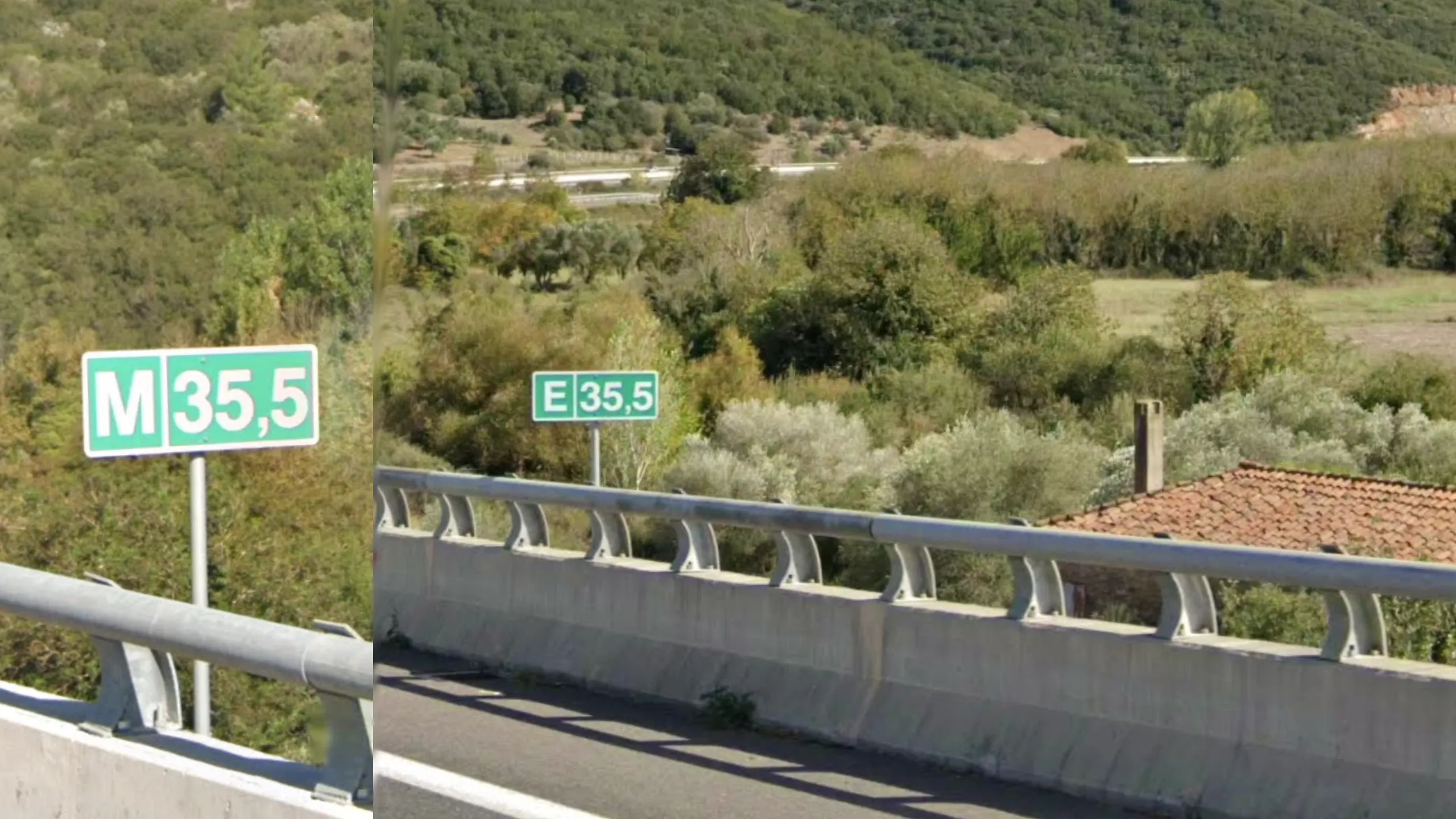 Some highways in Greece have unique and helpful kilometer signs that can help regionguessing. On most highways you will find green km signs every 500m that indicate the distance from the start point on the right side, and the first letter of the name of the town at the end of the highway on the left side. Note that the number from the start point is the same on both sides of the highway, whereas the letter is dependent on your driving direction. Also note that if you are in a moving game, these signs are symmetrical so you can always find the km sign for the other direction in the opposite lane.