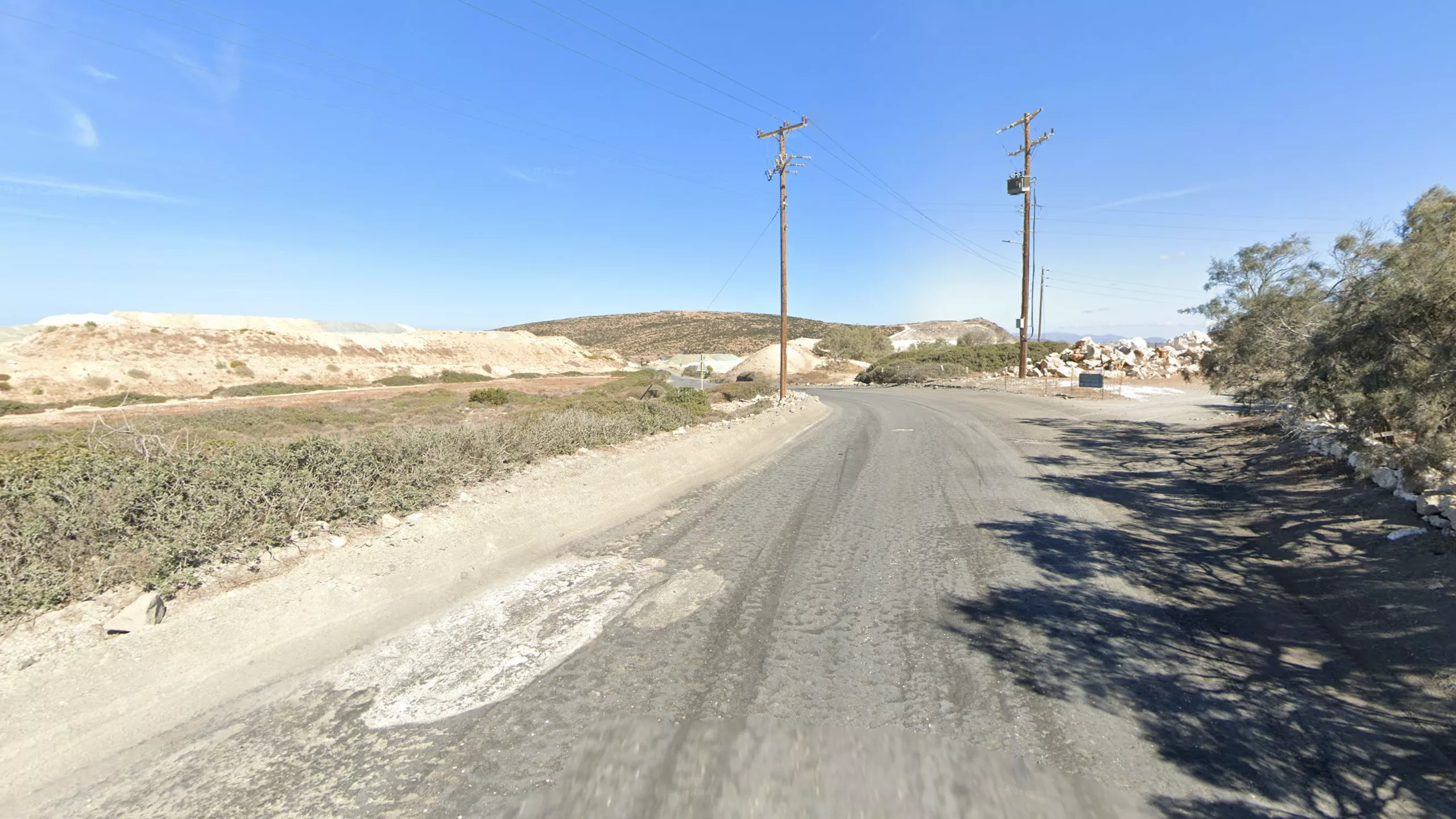 Milos is one of the most mined out Greek islands. You can usually identify it through a great number of sandy roadside berms, large boulders, or numerous quarries in the distance.